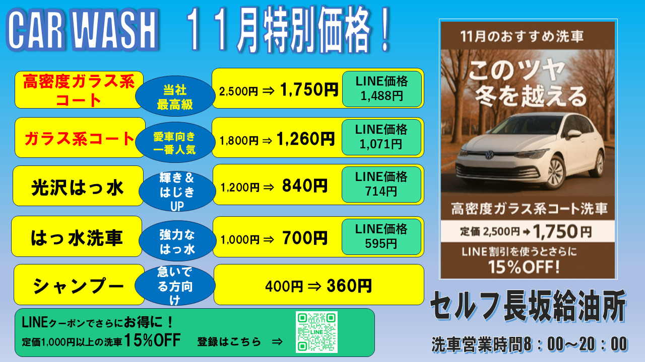 セルフ長坂給油所 11月洗車特別価格のご案内