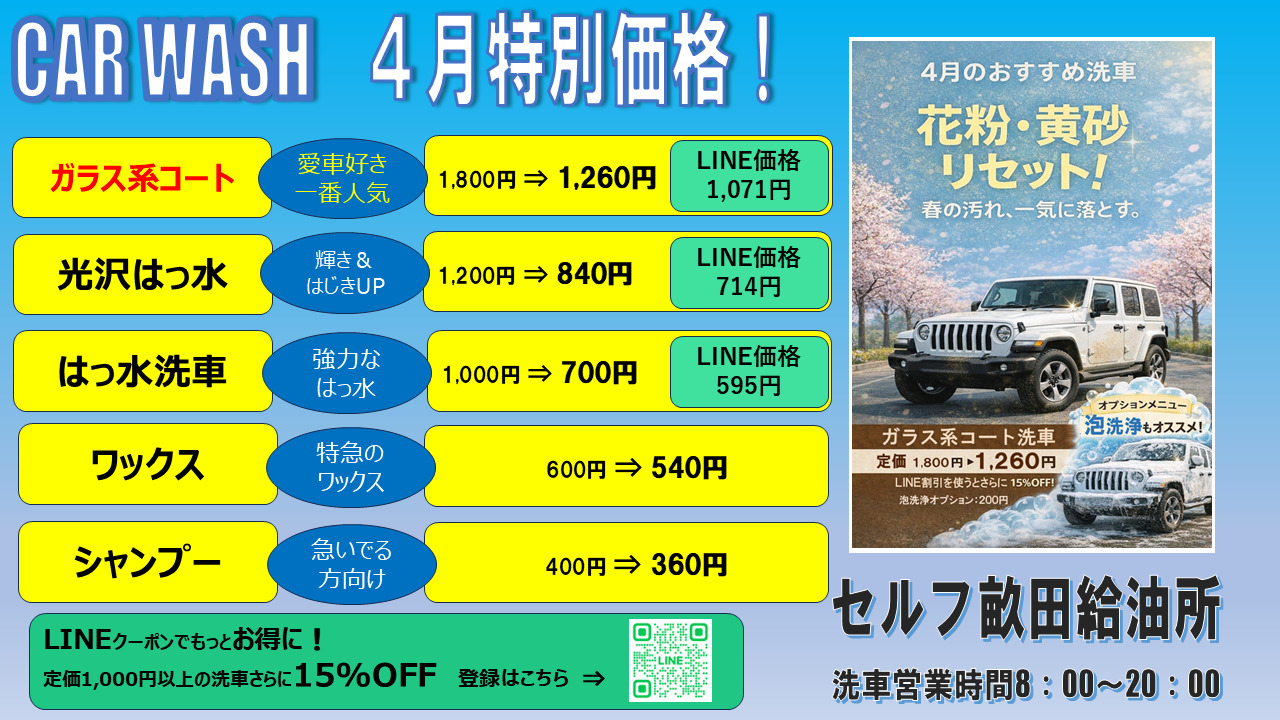 セルフ畝田給油所 4月洗車特別価格のご案内